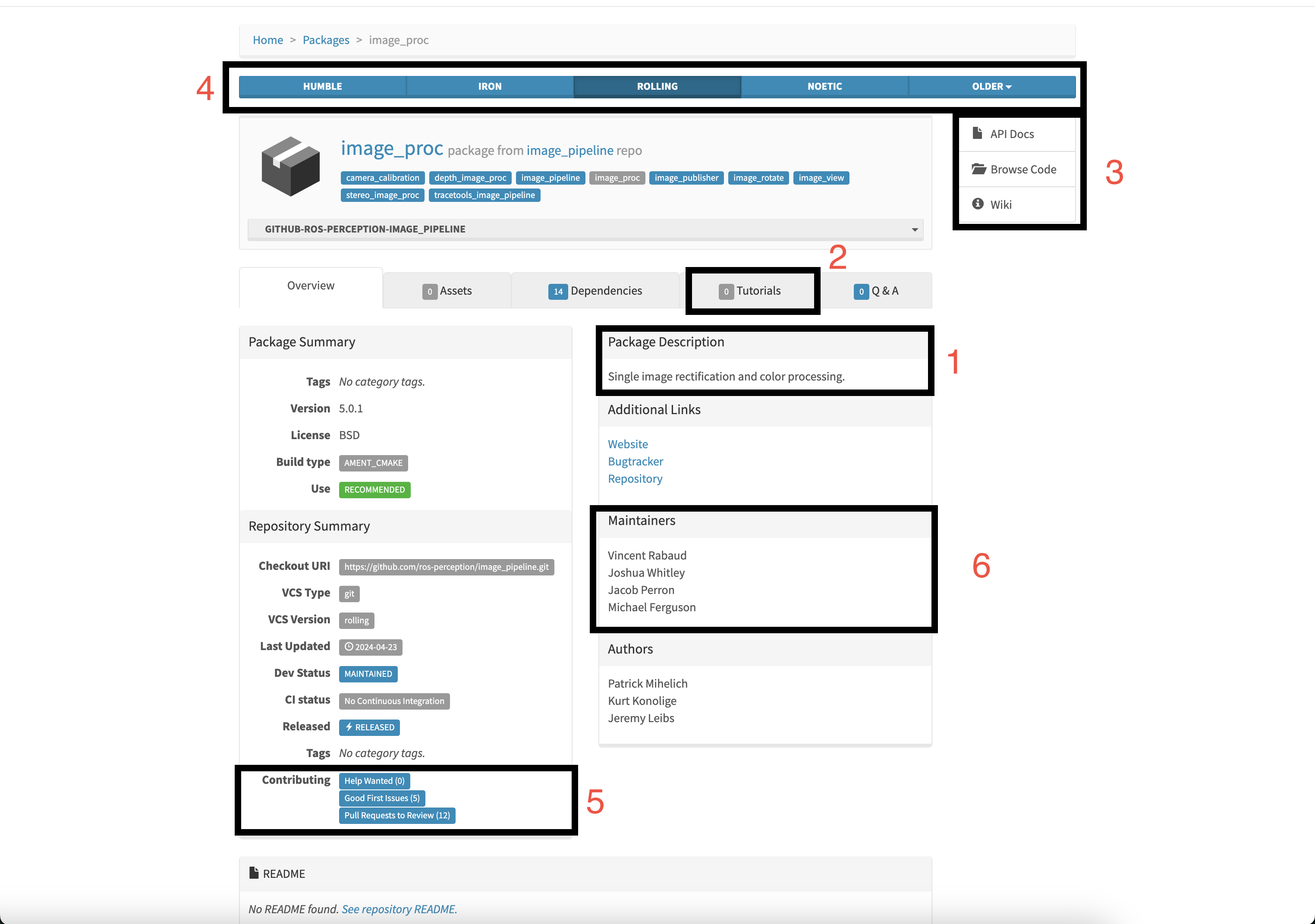 Package DescriptionThe general description of the package, this should be similar to what was searched if it wasn’t an exact package name.DocumentationThe original documentation for the ROS package and the repository where source code and documentation can be found.DistributionROS 2 has various distributions which may have differences in design. Click on the ROS distribution (version) that matches the ROS version installed on your system.ContributingThis software is open source, so it needs the community’s help to actively be maintained. One should utilize this section if they wish to help solve issues, review pull requests, or are looking to see if an active fix is being deployed for a problem they encountered.MaintainersThis tab lists the community members who are actively responsible for the development of the package. While the maintainers have a vast amount of information one should use the Robotics Stack Exchange https://robotics.stackexchange.com/search?q= with the [tag] of the package, if they want questions answered.